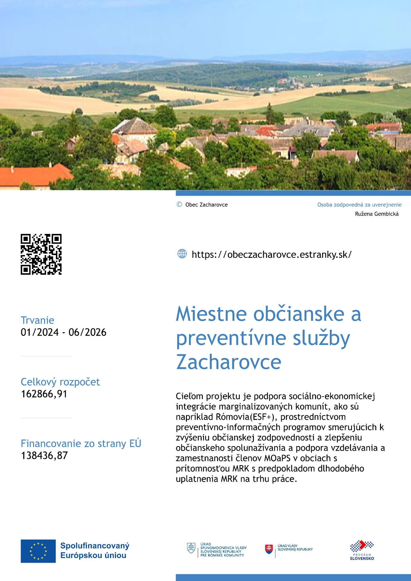 Dňa 25.1.2024 bola na stránke https://www.crz.gov.sk/ zverejnená zmluva s názvom "Zmluva o poskytnutí nenávratného finančného príspevku pre projekt č. 401406DLM4 s názvom: Miestne občianske a preventívne služby Zacharovce".